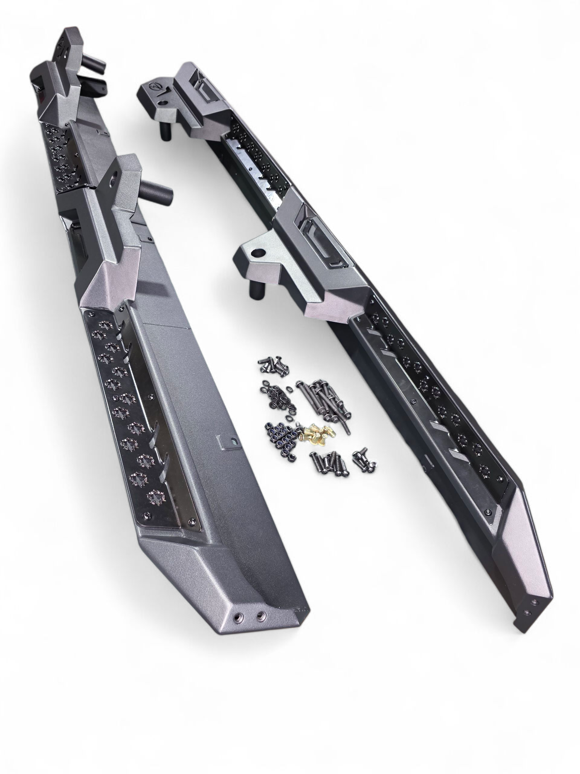 The Elektric Offroad Designs Volt Series 2016+ Can-am Defender Volt Rocker Steps provides added protection to your side by side. Our sliders give added protection to the Defender's body when squeezing through tight places on your run. Our built-in step function with grip plating allows for traction. These steel sliders are finished in a hammer black powder coat and the aluminum accent plates are finished in a satin black powder coat. Installation features a simple bolt-on process.