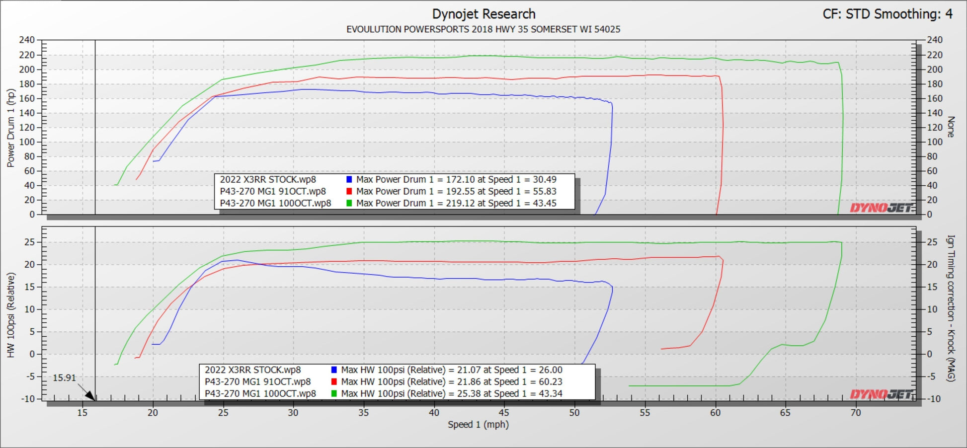 DYNO NOTE: Due to the MG1 ECU torque strategy, the boost figures listed represent maximum boost on a hot engine. When intake temps are cooler, boost will be lower, however, it will make the same power as when the boost is higher. The ECU always tries to make the same power given environmental conditions and it does this by allowing the boost to increase as the intake temperature climbs.