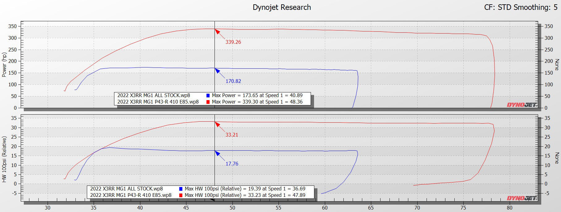 DYNO NOTE: Due to the MG1 ECU torque strategy, the boost figures listed represent maximum boost on a hot engine. When intake temps are cooler, boost will be lower, however, it will make the same power as when the boost is higher. The ECU always tries to make the same power given environmental conditions and it does this by allowing the boost to increase as the intake temperature climbs.