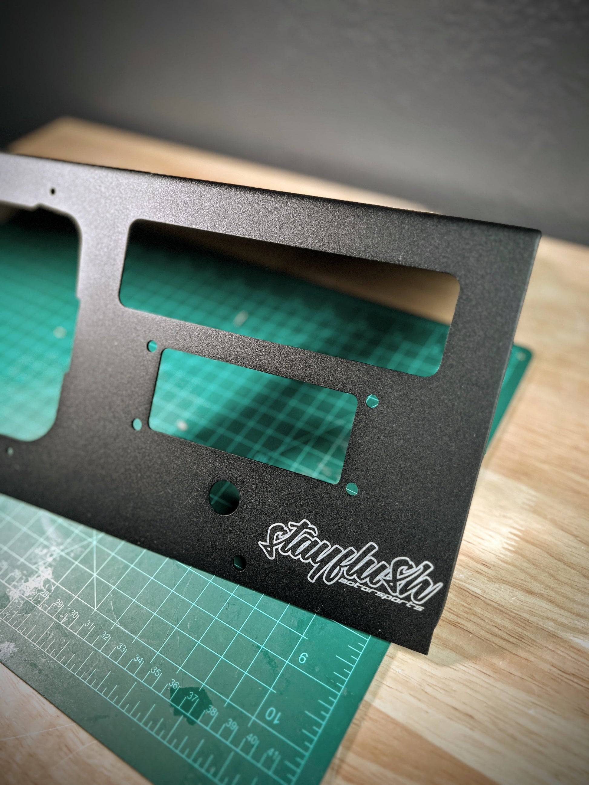 Now is your chance to put that glove box area to good use! These consoles are currently made to order with about 3-4 week lead time after design is approved. If it fits we will mount it! Made from 14 aluminum and comes with any hardware needed for mounting. Final console is powder coated black texture to match your factory dash. This console eliminates your factory glove box and adds room for your comms and accessories. Logo Placement will depend on your accessories. Feel free to email us with any questions!